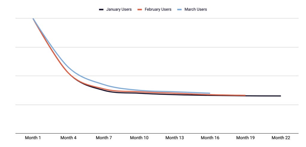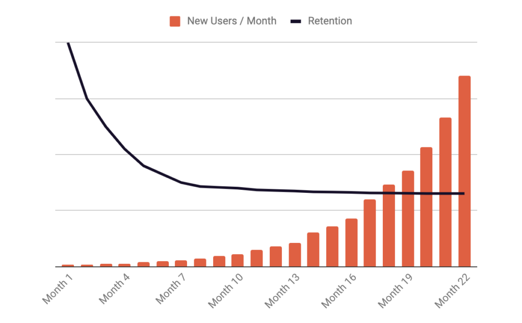I’ve seen many founders misunderstand this, looking for growth hacks to drive growth or a PR bump. These types of tactics are only useful if they help you sequence to a sustainable growth strategy, but they rarely are sustainable growth strategies directly. This is why other measurements of satisfaction can still be important. If it doesn’t exist, the first two of these loops are impossible to drive growth from. Sustainable growth is measured by one or more of these loops growing the size of your monthly acquisition cohorts month over month with a flattened retention curve. A flattened retention curve of your key action at the designated frequency plus month over month growth in new customers is the best way I have found to measure true product/market fit. If the rate of retention can't support acquisition loops that continue to scale new users, retention needs to be improved to find product/market fit. Some companies can scale with 10% retained users, and some may need 40%, all depending on the strength of the acquisition loop. The graph below represents one month’s cohort retention over time vs. monthly growth in new users.