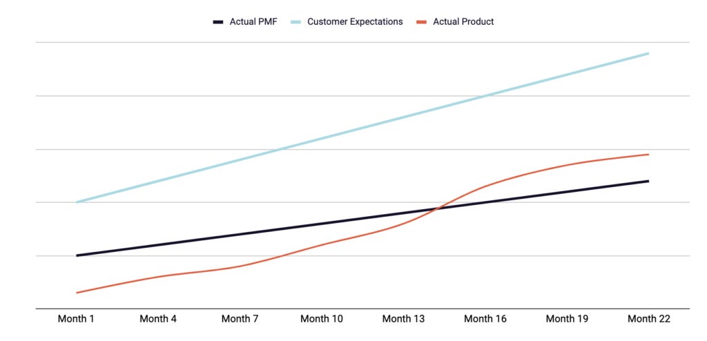As a product leader with a background in growth, it’s surprising how much what I actually end up working on is product/market fit. Product people should only be focused on growth i.e. connecting people to the value of a product once they’ve confirmed the product is delivering value. So it’s important to have a strong understanding of what product/market fit looks like before investing in growth. Founders and product leaders struggle with answering this question however, and advice and blog posts on the internet frequently espouse that you’ll know product/market fit when you see it, and that all of a sudden everything will start working. It’s not very actionable advice. I don't claim to be the world's foremost expert, but this is what I learned through scaling multiple startups, launching new products, and advising and investing in dozens of companies. The Quantitative Approach to Product/Market Fit I define product/market fit as satisfaction that allows for sustained growth. Satisfaction is tricky to understand because, well, customers are rarely truly satisfied. Jeff Bezos frequently drops pearls of wisdom in his shareholder letters, and my favorite of them is the following: One thing I love about customers is that they are divinely discontent. Their expectations are never static – they go up. It’s human nature. We didn’t ascend from our hunter-gatherer days by being satisfied. People have a voracious appetite for a better way, and yesterday’s ‘wow’ quickly becomes today’s ‘ordinary’. To put that in product/market fit parlance, product/market fit has a positive slope. The expectations of the customer continue to increase over time, and in fact, total satisfaction is likely an asymptote impossible to achieve. So what is product/market fit then? Product/market fit is not when customers stop complaining and are fully satisfied. They’ll never stop complaining. They’ll never be fully satisfied. Product/market fit is when they stop leaving. Represented visually, customer expectations are an asymptote a product experience can rarely hope to achieve, but product/market fit is a line a product can jump over and try to maintain a higher slope than over time.