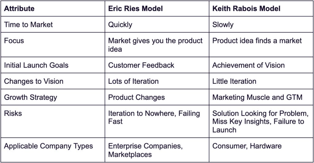If you are in the first phase, you generally aren’t allowing customers to use the product anyway to measure product/market fit. There are two main schools of thought for how long you should stay in the first phase, which I will oversimplify into calling the Eric Ries model and the Keith Rabois model (unfair to both of them), and they are diametrically opposed on many axes including how long you build before you allow customer access. Thinking about these axes will help you understand what to do next and what successful companies did in this phase. I will outline some of the main differences below.