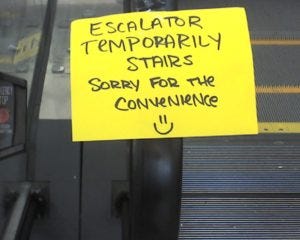 An escalator can never break -- it can only become stairs. You would never see an "Escalator Temporarily Out Of Order" sign, just "Escalator Temporarily Stairs. Sorry for the convenience". We apologize for the fact that you can still get up there.