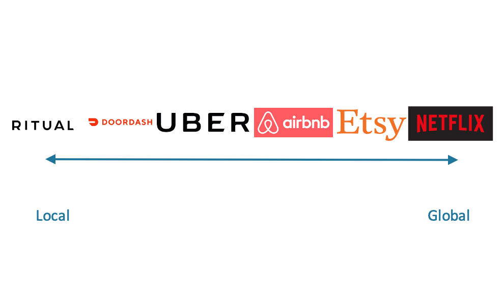 Cross-side network effects can be painfully difficult to find product/market fit for because you are building out a product for two different types of customers that have to align. It can feel like building two companies at the same time. Fortunately, there are some easy ways to navigate this puzzle to make the journey to product/market fit less amorphous. The first is that for businesses like marketplaces, it tends to be easy to understand how to constrain the audience initially. The first thing to understand is that there a spectrum of network effects from global to local:
