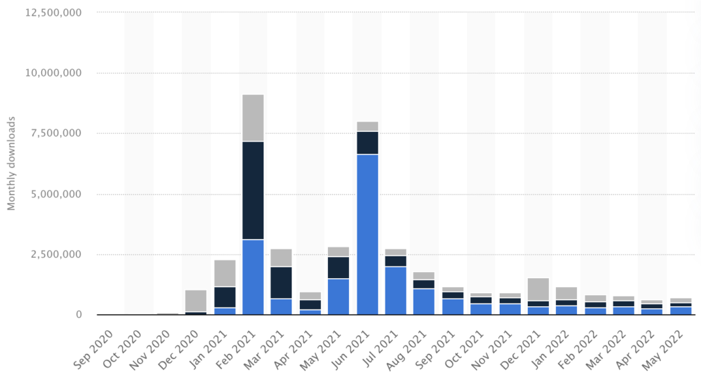 Clubhouse downloads per month. This graph is not up and to the right.