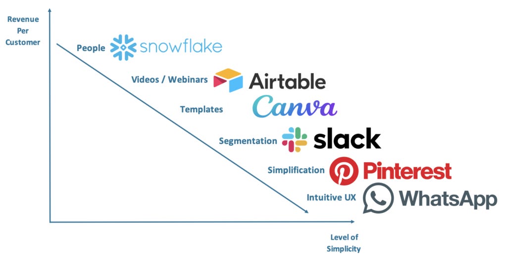 Now, myself and others have written before about different ways you should attempt to defy this second step. Let’s say you’ve listened. How do you then keep your product simple while trying to grow, capture new audiences, and add new value props? Is the solution to… not do any of that, like a Craigslist? Seems like that doesn’t work too well given all of the companies that have attacked Craigslist from different angles and built bigger businesses than it. Is the solution to ignore Scott’s warning and rely on network effects or some other deep switching costs to retain users? This isn’t a bad idea, and why companies like Facebook continued to grow despite adding more and more complexity over time. During this time though, Facebook users also flocked to Instagram, Snapchat, TikTok, et al. Is the solution to rely on humans to help customers navigate the complexity? Sounds expensive.