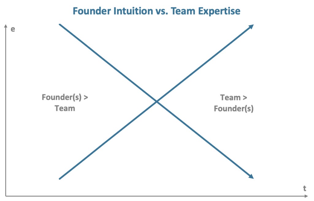 Great founders start to back away from relying on founder intuition when they see the expertise developing on the team, or are proven wrong in a meaningful way by the team that makes them start to question their often blind faith in their own judgment. Moving forward, founders have to calibrate how their intuition stacks up against team expertise on every topic of the business to know how much to intervene vs. let the team drive. Think of this as a simple graph.