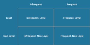 The first thing to understand is that every business has a loyalty problem; it just might not be the loyalty problem they're expecting. To make this clearer, I'll split consumers into four areas. Depending on where most of your company's consumers fit is where you'll spend your effort in thinking of a loyalty programs. The first thing to do is split all of your consumers into loyal and non-loyal and frequent and non-frequent. Loyal is defined by doesn't use a close competitor as well as you for what your product/service does. Frequency is a bit more nuanced. Your product/service should have a target frequency you're setting. For Pinterest, that might be daily. For GrubHub, that might be once or twice a week. You then can build a 2x2 matrix like the one below.