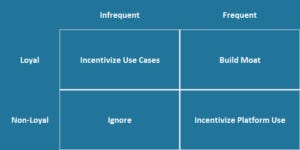 Frequent, Loyal Strategy: Build Moat In this segment, consumer are very active and don't use anyone else for your product/service. These are your best customers. So, a loyalty strategy shifts from trying to increase how often someone use the platform to doing all you can to make sure these consumers don't decrease their use of your platform or are wooed away by a competitor. This is by definition a money losing strategy to decrease risk instead of a money making strategy in the first two segments. Moat strategies can take many different forms and are frequently misunderstood. Some start out looking like the same strategy as frequent, non-loyal. One common one is to increase switching costs. One example of that is Facebook shutting off friend access to competing apps.