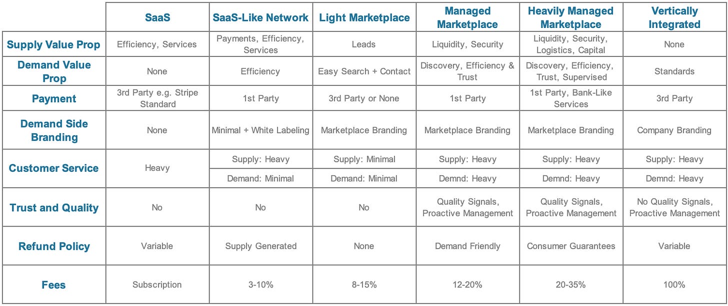 -- We hope this helps people building marketplaces understand the different styles of marketplaces out there and what that tends to mean for what a company has to build to be successful in them. Not understanding the spectrum of models means that companies can build the wrong things in the wrong order, preventing them from sequencing effectively. The same is true for platforms, which we will discuss in the next essay.