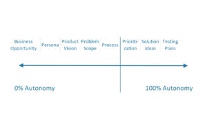 This is where we chose to sit on the autonomy spectrum. Prioritize business opportunity, vision, scope, and some process. Create autonomy for the team to define solutions and deeper process on how they want to get there. There are of course other options here. We could have chosen to prioritize ideas the teams invent to solve these problems, even come up with the solutions or how they would validate with research and experiments. There is no clear cut place to draw the line where you start thinking this way.
