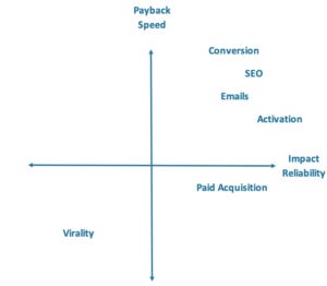 What growth teams sometimes miss is that optimization is not always the answer to a growth problem. It may require a new product or building a sales team. Modeling your loops to understand your constraints to pick tactics that alleviate those constraints takes some time to do well. A framework I’ve used for more quick and dirty decision making is using data companies usually have on hand: whether a tactic is reliable or not historically in driving growth i.e. you can predict the output from an investment or not, and how fast the payback period is.